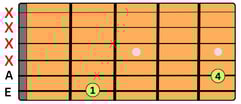 These power chords below only use two different notes like the ones above but they are played using two different fingers; the 1st and 3rd fingers or the 1st and 4th fingers. They are most commonly played from the E and A strings at any fret, but can be played from the D string too.