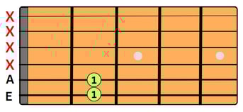 Some of these power chords below also use one finger but now we’re trying to fret two strings with one finger. This is a bit harder so if you can’t play these then stick with the closed power chords above for now; they are the same chords anyway.